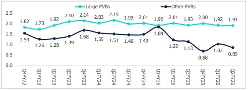 RoA for Large PVBs declined marginally by one bp q-o-q to reach 1.91% in the quarter, attributed to margin compression. Meanwhile, Sequentially, RoA for other PVBs decreased by 17 bps q-o-q to 0.85% in Q2FY26 due to slower corporate loan demand impacting asset mix, and elevated opex. The decline was further amplified by one PVB reporting losses for a second consecutive quarter, alongside higher credit costs in unsecured and MFI portfolios.