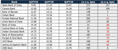 * The median CAR for PSBs rose significantly by 54 bps y-o-y to 17.2% for Q2FY26, while for PVBs, the median CAR rose by 52 bps y-o-y to 16.8%, as a faster increase in risk-weighted assets partly offset capital growth. This expansion in capital levels was supported by rising profitability. Additionally, substantial internal accruals from earnings have bolstered reserves, while additional capital has been mobilised through bond issuances and capital infusions.