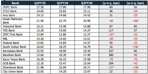 * In contrast, PVBs saw a decline of 2.1% y-o-y to Rs 0.43 lakh crore in Q2FY26, majorly attributable to stress in unsecured and the microfinance segments, lower credit growth and increased provisioning. Additionally, if we include the one-off regulatory provision for one PVB due to discontinued loan products, net profits for PVBs would have declined by an additional 4.0% y-o-y.
