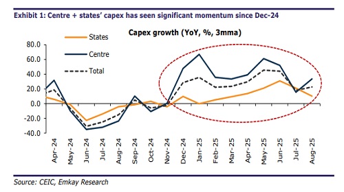Emkay Global Financial Services in its latest report on Public Capex Economic update, cited that India’s public capital expenditure has maintained its strong momentum through the first five months of FY26, with both the Centre and States spending at a healthy pace. The Centre has already utilized nearly 39% of its budgeted capex, registering over 43% year-on-year growth, while States have increased their capital spending by around 14%. Despite the headline numbers appearing inflated due to base effects and sector-specific anomalies, Emkay Research notes that the “core capex,” after adjusting for one-off items, has also posted a robust 16% increase, indicating sustained investment activity across key sectors.