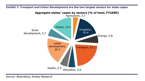 On the macro-fiscal front, Emkay Research projects that the general government’s capex-to-GDP ratio will hover between 4.9% and 5% in FY26. This would mark a slight decline from 5.1% in FY25 (provisional) and well below the FY24 peak of 5.4%. Nonetheless, the ratio remains significantly higher than pre-pandemic averages, indicating that India’s public investment-led growth model remains intact. The report adds that while fiscal deficit risks persist—especially due to slower revenue growth and GST rationalization—the Centre could offset potential shortfalls by trimming non-essential capex and reprioritizing spending. States, on the other hand, may see their fiscal deficits remain above 3% of GDP for the third consecutive year, underscoring the need for improved revenue mobilization and expenditure discipline.