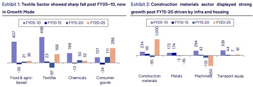 * Textiles: The textile sector has experienced significant ups and downs in GFA growth over the past two decades. It expanded to 498.09% in FY05–10, driven by strong demand, abundant raw materials, and supportive government policies. Growth slowed to 23.08% in FY10–15 due to rising input costs, infrastructure challenges, and increasing global competition. A sharp decline of -96.64% in FY15–20 followed, caused by policy disruptions (such as import duties and quality control orders), cotton price volatility, and weak international demand. The sector made a strong comeback with 167.71% growth in FY20–25, supported by initiatives such as PM MITRA Parks, PLI schemes, SAMARTH skilling program and rising domestic consumption.