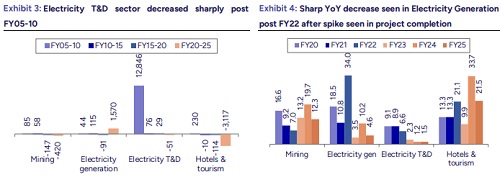 * Electricity Generation: The Electricity Generation sector has shown a volatile GFA trend over the last two decades — starting with moderate growth of 44.02% in FY05–10, driven by rising electricity demand and infrastructure expansion; accelerating to 114.92% in FY10–15 due to policy reforms, Ultra Mega Power Projects, and increased private investment; then declining to -90.79% in FY15–20 amid financial stress in distribution companies, delays in thermal capacity additions, and overcapacity issues; followed by a sharp rebound to 1570.22% in FY20–25, led by record investments in renewable energy, especially solar and wind, supported by policy incentives and large-scale capacity additions.