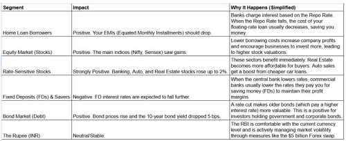 The move was seen as highly constructive for financial markets. The stock market reacted positively because the rate cut directly reduces the cost of capital for businesses, which generally leads to higher profits and encourages them to invest and expand, boosting stock valuations. Rate-sensitive sectors, such as Real Estate, Banking, and Automobile companies, saw immediate gains. In the bond market, the cut was also positive, causing existing bond prices to rise and bond yields to fall. To ensure that the entire banking system supports this policy, the RBI also announced major liquidity measures, including a large Rs.1 lakh crore purchase of government bonds and a $5 billion Forex Swap, guaranteeing that banks have plenty of cash available for lending to businesses and individuals. Now, the RBI's key focus will be on ensuring "Monetary Policy Transmission," which is the process of getting commercial banks to quickly and fully pass on this lower rate benefit to their customers.