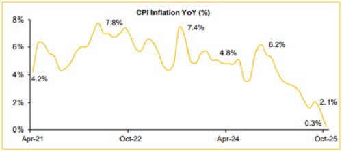 * CPI inflation for Oct-25 stood at multi-year low of 0.25%, declining for the third consecutive month. Food inflation with 50%+ weight was a major contributor to soft prices, coming in at -5.0% in October 2025 (vs. 10.87% Oct, 24).