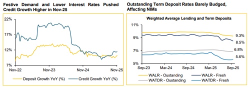 * Moreover, credit growth for the fortnight ended November 14 was 11.5% YoY. Further, driven by the current rate cut and better transmission of previous cuts, we expect credit growth to come in the range of 11.5%–12.0% by FY26E.