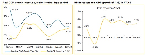 * Real GDP growth in Q2FY26 came in at 8.2%, driven by robust imports (+12.8%), consumption (+7.9%) and capex (+7.3%). Sectorally, growth was led by financial, real estate and professional services (+10.2%), manufacturing (+9.1%) and construction (+7.2%).