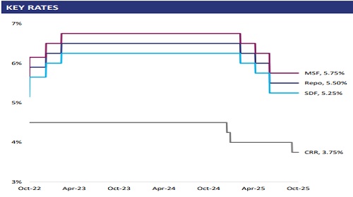 Projection for consumer inflation was dragged down sharply to 2.6% y/y for FY26, a full 50bps below Aug’25 figure. The benign food inflation seen in 5MFY26 is expected to continue for the remainder of the fiscal based on excellent food production expected on good monsoons and GST rate rationalisation driving down prices. Inflation concerns have clearly receded, but volatility remains at the forefront, highlighted by the sharp change in RBI’s projections in a matter of months. With Core staying stiff on precious metal prices and crude prices prey to geopolitical tussles, inflation will remain a monitorable