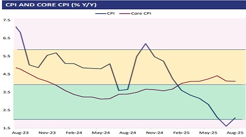 Repo rate was kept at 5.50% by a unanimous decision. The policy stance has been retained at “Neutral”, though two members wanted it be to changed to “Accommodative”. Confidence on curbing inflation remains high, helped by bounteous monsoons, though Core inflation and fuel prices should be in the line of sight. Growth projections were adjusted upwards, though the downward sloping trajectory as FY26 ends was steepened. We anticipate another ~25bps rate cut in the current cycle, with the timing depending on growth figures in H2