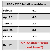 We understand that the RBI’s decision to keep rates steady is hinging on clarity around external and domestic uncertainties, including tariff hikes, GST cuts, and transmission of past easing, while their continued focus on the 1-year-ahead expected inflation (that is looking well above 4%) may have also weighed in. We see risks of a further undershoot of ~30-40bps in RBI’s FY26/FY27 inflation forecast, which could support the case for a December rate cut (and beyond, depending on how tariff effects evolve). Given the repeated undershoots versus forecasts, we believe the focus on one-year-ahead expected inflation looks increasingly misplaced in a fast-changing environment, particularly as Asia’s macro backdrop shifts toward a disinflationary bias. Domestically, core inflation (ex-gold/silver) continues to ease, reflecting softer demand. FY26 nominal GDP is likely to print below 8%, necessitating a recalibration of key macro and market variables—fiscal deficit/GDP, debt/GDP, credit growth, corporate earnings, and FPI flows, among others. A shortfall in nominal growth would mean that a much sharper fiscal compression is needed for achieving similar debt/GDP improvements. This macro reset calls for front-loaded rather than back-loaded policy support. The timing and magnitude of rate cuts ahead will therefore be crucial.