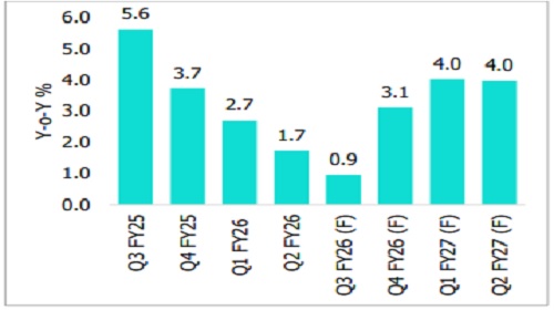 While, growth remained strong in H1, we expect some moderation in the growth momentum in H2. We expect the GDP growth to moderate to around 7% in H2 (vs 8% in H1) as the impact of front loading of exports fades and consumption demand moderates post festival season. By the fourth quarter of FY26, the low base effect will wane, and deflator will also increase from the current low levels. However, for the full year FY26, we estimate the GDP growth number to remain strong at 7.5%, mainly supported by strong H1 growth. Even with the trade related uncertainties lingering, we expect GDP growth at around 7% in FY27. Given the strong growth performance in H1, the RBI is likely to revise its FY26 growth forecast to around 7.5%, up from the earlier projection of 6.8%.
