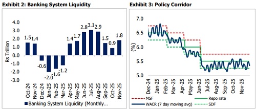 Currently, the banking system liquidity surplus stands at Rs 2.4 trillion (as of 1st Dec 2025), equivalent to about 0.95% of NDTL. The average systemic liquidity in November 2025 rose to Rs 1.8 trillion from Rs 0.9 trillion in October 2025. The liquidity surplus had narrowed in October amidst tax outflows and the RBI’s intervention in the forex market. However, RBI’s VRR auctions, last tranche of CRR cut (injecting ~Rs 600 billion in end November) and RBI’s OMO purchases in the secondary market (Rs 273 billion as of mid-November) are likely to support liquidity conditions.