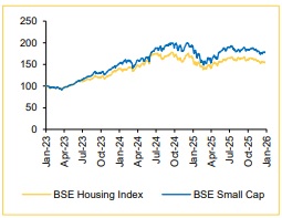 For Q3FY26, we expect marginal YoY volume growth across segments in the Building Materials space, with operating margin likely to improve, supported by higher volumes. Pipe volume is projected to grow ~2% YoY, driven by demand from real estate, infrastructure and home improvement. EBITDA/kg for our coverage universe is expected to decline ~10% YoY, reflecting a higher contribution from lower-margin products and a decline in PVC prices. The bathware segment is expected to deliver ~20% YoY revenue growth, while tile volumes are projected to grow ~6% YoY. In the wood panels segment, plywood and MDF volumes are estimated to grow ~12.0/13.6% YoY, respectively, with segment margin expected to expand ~69 bps, aided by plywood price hikes and an improved product mix.