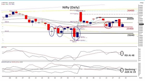 Recovery on the final trading day of the week following the sharp decline helped restore stability above the 25400-support zone. The bullish undertone was briefly threatened as the index failed to attract buying interest near higher levels and slipped below the immediate swing support at 25640, which accelerated the decline. However, the index successfully defended its major demand zone around 25400. Earlier, this pivotal level had been reinforced by a clear Bullish Engulfing pattern on the daily chart, with subsequent follow-through validating it as a strong demand base. On the downside, a decisive break below 25400 could expose the index to further weakness toward the 25040 support. On the upside, the convergence of multiple moving averages near 25670 now acts as a key hurdle for any immediate relief rally. A sustained move above 25700 would be the first signal of trend continuation, with interim resistances placed at 25850 and 26000 during the week. From a structural perspective, as long as the index sustains above 25400—and more tactically above 25640 on a weekly closing basis—the broader bullish setup remains intact. Conversely, a clear breach below 25400 would negate the positive bias. Fresh aggressive long positions are advisable only on a decisive breakout above 25750, which could revive momentum and open the upside toward the 26000–26400 zone.