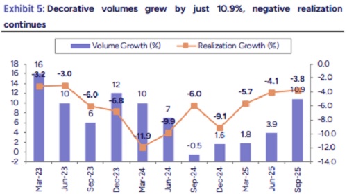 Decorative volume grew 10.9%; Consol Revenues grew by 6.3% YoY to Rs85.3bn (PLe: Rs84.28bn. Consensus Rs81.5bn). Decorative volume grew by 10.9%; while Industrial Coatings business registered 6.7% growth. Gross margins expanded by 242bps YoY to 43.2% (PLE 43.6%). EBITDA grew by 21.3% YoY to Rs15bn (PLe:Rs14.5bn, Consensus 13.4bn) Margins expanded by 218bps YoY to 17.6% (PLe:17.2%). Adj. PAT grew by 8.7% YoY to Rs9.9bn (PLe:Rs9.54bn, consensus Rs8.88bn)
