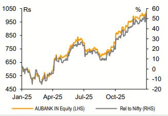 After a soft Q2, AU SFB bounced back in Q3 and reported nearly in-line PAT at Rs6.7bn/1.6% RoA. This was mainly due to better growth/margin and lower provisions, partly offset by higher opex (C/I ratio at a high of 60%), as it transitions toward becoming a retail-heavy Universal Bank. Overall asset quality is trending well, with GNPA ratio steadily moderating to 2.3%, benefiting from contained slippage and strong credit growth. However, specific PCR has now slipped to a low of 62% to support profitability, which is slightly disappointing, more so in view of the ensuing ECL implementation in AU. We largely retain our earnings estimates for FY26-28E, with our RoA assumptions steadily improving to 1.5-1.7%, but managing operational cost will be key to sustaining the momentum. We retain REDUCE and TP of Rs875, as current valuations (3.4x/2.9x FY27E/FY28E ABV) are running ahead of fundamentals.