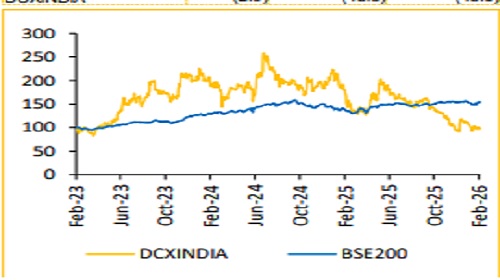 We believe DCX Systems delivered another materially weak quarter, with continued pressure across revenue, margin and profitability. Execution challenges were there in the past and still persist. It raises concerns regarding the company’s ability to convert its order pipeline into sustainable earnings. Moreover, the management’s limited communication with the shareholders and lack of execution clarity add to near-term uncertainty. As of September 2025, while the order book remains healthy at ~INR 2,600 Cr (~2.4x FY25 revenue), backlog strength alone is insufficient without consistent execution and margin stabilisation. Repeated quarterly underperformance has weakened confidence in delivery timeline and operating leverage assumption. At this stage, visibility on earnings normalisation remains limited. The only structural positives lie in broader geopolitical realignments. The strengthening of India–US defence relationship and Israel’s potential shifting of defence manufacturing to India could create incremental outsourcing opportunities for domestic EMS players, such as DCX. However, these remain optionalities rather than near-term drivers of earnings. Given the persistent execution gaps and lack of margin recovery, we maintain a cautious stance on DCX. We maintain our REDUCE rating with a revised target price of INR 170, valuing the stock at 30x of FY28E EPS. We would turn constructive only upon tangible evidence of sustained execution improvement, margin stabilisation and stronger management communication.