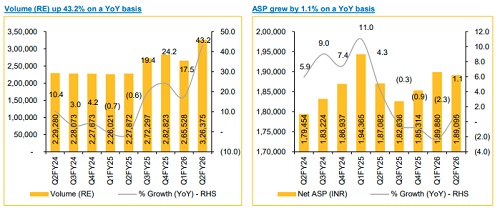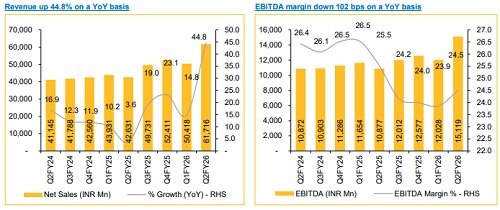 * Revenue was up 44.8% YoY (+22.4% QoQ) to INR 61,716 Mn (vs CIE est. at INR 60,733 Mn), led by 43.2% YoY growth in volume and 1.1% YoY in ASP.