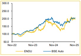 Broad-based Growth despite Near-term Margin Pressure: ENDU delivered a strong operational performance in Q2FY26, led by broad-based growth across India and Europe and sustained traction in proprietary and EV-linked products. Consolidated revenue grew 23% YoY to INR 35,828 Mn, with EBITDA rising 24.8% YoY to INR 4,768 Mn (13.3% margin), demonstrating steady topline expansion despite short-term margin pressure. On a standalone basis, revenue grew 16.2% YoY, significantly outpacing domestic 2W industry’s 10.3% YoY growth, reaffirming Endurance’s ability to outperform the market through customer diversification and value-added product offering. However, EBITDA margin declined 116 bps YoY to 12.5%, primarily due to temporary cost headwinds, which we view as strategic investments for growth.