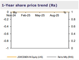 View: Per our initiation report, we are positive on JSWCL’s ability to deliver robust volume growth, along with improving EBITDA/t; hence, we estimate 33% EBITDA CAGR over FY25-28E. Given that Q2FY26 performance was tracking FY26E EBITDA, we broadly retain our estimates. However, at 13x 1YF EV/E, risk-reward ratio appears balanced, and we see a limited upside to the stock. We still value JSWCL at 12x EV/E. We maintain REDUCE, with an unchanged TP of Rs135.
