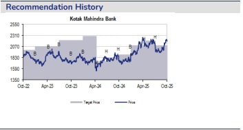 We have increased our FY26/27E EPS by ~3-4% to factor in lower credit cost and opex. We expect loan CAGR of ~16% during FY25-27E with avg. RoA/RoE of ~1.9%/11% in FY26/27E. Given ~10% rally in stock in last 1 month, KMB’s current standalone valuation of 2.0x FY27 BVPS is ~10% discount to HDFCB/ICICIB. We downgrade the stock to REDUCE and keep TP unchanged at INR 2,100, valuing the core bank at 1.9x FY27E BVPS.
