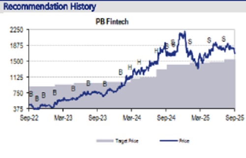 * Upgrade to REDUCE (new rating system) with Sep’26 TP of INR 1,610: With the stock going through a time-correction since we downgraded to Sell last September, we now find marginally improved risk-reward. Hence, we upgrade the rating to Reduce as per our new rating system, still remaining cognisant of a tougher demand (Savings business, particularly) environment and regulatory tail risks. We value PB Fintech at 50x Sep’27 EV/ EBITDA considering near-term revenue growth around Q1FY26 levels with contribution margin accretion driven by rising renewals mix and Paisabazaar expansion.