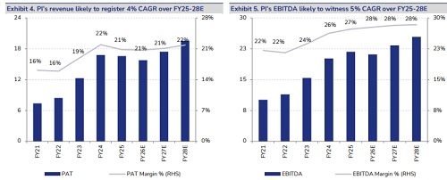 * Estimate 5% EPS CAGR over FY25-28E; maintain REDUCE: The company has refrained from any guidance due to the uncertain outlook. We now build in 7% CSM contraction in FY26 and a generous ~8% CSM growth in FY27/28. Factoring in this and management commentary, our FY26-28 EPS estimates are revised downwards by ~5-6%. In our view, there could be further downside risks to our current estimates in case ex-pyroxa business fails to pick up meaningfully in FY27. We now expect PI to register 5% EBITDA/EPS CAGR over FY25-28E. Though the company’s efforts for diversification in pharma and electronic segments, as well as ex-Pyroxa agri portfolio are visible, the wait for the meaningful contribution continues. We roll forward to Dec’27E earnings and maintain REDUCE with a revised Dec’26 TP of INR 3,590 (from INR 3,570 earlier) (based on 30x Dec’27E EPS).