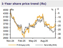 The mgmt’s outlook remains cautiously optimistic for H2, backed by committed customer offtake. The company guided for a pickup in Q4FY26; however, Q3 is expected to remain muted. We build in a low single-digit decline in FY26 (-4% YoY for overall revenues, -8% for CSM exports). The mgmt expects a recovery in the overall agchem market in H2FY26; the current environment, though, remains uncertain, led by macro uncertainties and environmental challenges. PI stayed with its EBITDA margin guidance of 25-27% for FY26, even though H1 margins were higher at ~28%. In H1, contract assets increased by ~Rs4.5bn as the company recorded revenues for the orders that were in place and for which deliveries had been deferred (we believe this was for pyroxasulfone inventory).