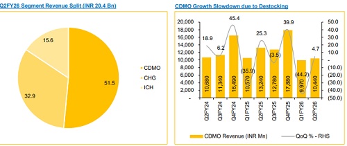 EBITDA margin remained under pressure, impacted by operating deleverage and inventory destocking in a high-margin product. We now expect margin (including other income) to decline meaningfully to 13.5% in FY26 (vs 17.3% in FY25), driven by sub-optimal utilization at US facilities such as Lexington, along with continued CDMO weakness from destocking. Margin recovery is expected from FY27 onwards, as facility utilisation improves and destocking normalises.