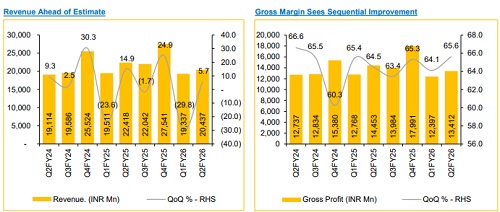 * Revenue de-grew 8.8% YoY but up 5.7% QoQ to INR 20,437 Mn (vs. CIE estimate: INR 21,140 Mn).