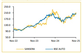 Strategic Diversification and High-growth Non-Auto Focus: The Aerospace, Defence and Semiconductor (ADS) segment is a key strategic focus for SANSERA and is identified as the primary long-term growth driver for the non-auto business. The management expects ADS to contribute INR 3,000–3,200 to revenue in FY26. The company is actively pursuing high-value added products in ADS and moving towards higher value per part. The ADS division delivered a top line of INR 496 Mn in Q2FY26 and the current capacity for ADS can cater up to about INR 6,000 to 6,500 Mn of the existing orderbook. This segment is showing resilience to geopolitical developments owing to diversified end markets and exemption to aerospace customers. We believe SANSERA's diversified portfolio in segments (auto, non-auto), geographies, customers and product ranges positions it well to navigate market disruption and deliver profitable growth.