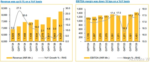 * Revenue was up 8.1% YoY and up 7.7% QoQ to INR 8,252 Mn (vs CIE est. at INR 8,244 Mn).