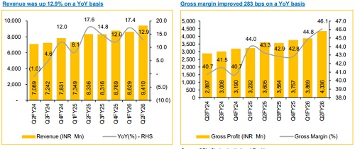 * Revenue was up 12.9% YoY and up 9.1% QoQ to INR 9,410 Mn (vs CIE est. at INR 9,170 Mn).