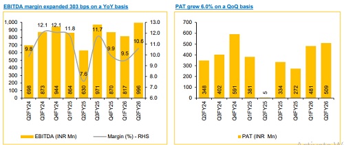 * EBITDA was up 58.1% YoY and up 21.8% QoQ to INR 996 Mn (vs CIE est. at INR 926 Mn). EBITDA margin was up 303 bps YoY and up 111 bps QoQ to 10.6% (vs CIE est. at 10.1%).