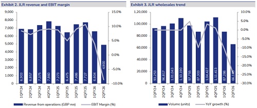 * JLR – challenging outlook: JLR highlighted that sales in the EU remain uncertain, while the UK continues to be stable. Demand in the US remains weak due to tariff-related issues, and in China, the reduction in the luxury tax threshold (from RMB 1.3 mn to RMB 0.9 mn) has further dampened demand, with JLR expected to absorb the cost impact in the near term. Management indicated that variable marketing expenses (VME) will remain elevated. On tariffs, some improvement is expected in 3Q (majority part of 2Q had lower tariffs). Overall, geopolitical tensions, tariff uncertainty, and supply chain risks persist. Reflecting these challenges and the impact of the cyberattack, JLR has lowered its margin guidance, now expecting FY26 EBIT in the range of 0% - 2% (earlier 5% - 7%) and negative free cash flow of £2.2 - £2.5 bn (earlier near zero).