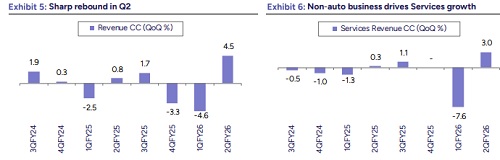 The revenue performance (+4.5% CC QoQ) exceeded our expectation of sequential de-growth (-2.3% CC), attributed to outperformance in non-Auto Service and Passthroughs within Tech Solutions. Aerospace and IHM grew 14.8% QoQ, while the Technology Solutions portfolio rebounded 7.6% QoQ. Surprisingly, Auto segment delivered positive growth despite the operational glitch (limited impact) within its top account, the demand recovery beyond marquee accounts has stabilized and aided growth. The engagement within Aerospace is progressing well and moving upstream to complex engineering activities, ensuring continued steady double-digit growth. Q3 is expected to see a slowdown in the Auto segment due to the phased recovery within topaccount that will partly offset by seasonal uptick in Technology Solutions, before a further rebound in Q4. The BMW JV is also progressing well and deployed 1000+ employees (beyond earlier milestone) in Q2, adding further visibility for next year. We are also factoring in ES-Tec acquisition that is expected to integrate in Q3, with that the organic growth for FY26 revised upward to -1.2%/11.0% (earlier -3.5%/10.1%) YoY CC for FY26E/FY27E. On margins, the beat was notable due to revenue outgrowing our estimates, we are passing on partial benefits due to unanticipated risk in Q3. We are revising our margin estimates upward by 40bps/30bps for FY26E/FY27E, assuming margin profile of ES-Tec is in line with Consol. We upgraded our rating to Reduce (from SELL) and set a revised TP of Rs. 640, valuing stock at 29x Sep27E LTM earnings.