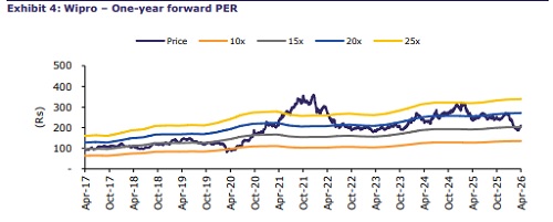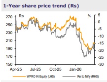 Wipro posted another quarter of weak revenue performance in Q4, due to delayed ramp?ups in select large deals and continued softness in specific BFSI accounts. IT Services revenue grew 0.6% QoQ to USD2.6bn (0.2% CC), below our expectations. IT Services EBITM declined by 30bps sequentially to 17.3%. Deal intake stood at ~USD3.5bn in Q4 (including 14 large-deal bookings worth ~USD1.4bn in total), with book-to-bill of 1.3x. The management gave guidance for -2% to flat QoQ CC revenue growth in Q1, slightly below our estimate. The midpoint of guidance assumes contribution from the OLAM Group and customer contracts of Alpha Net Group transactions for around half of Q1FY26. EBITM in Q1 is likely to face headwinds from 2 incremental months of salary hike (Mar-26 rollout), lower margin owing to competitively won large deals in the initial phase, integration of low-margin M&As, and investments in Wipro Intelligence. Even so, Wipro aspires to maintain margins in a narrow band over the medium term through operational efficiencies, cost takeout, and AI-driven productivity. We largely retain our estimates after factoring in the Q4 performance, M&As, and buyback; retain REDUCE and TP of Rs210 at 15x Mar-28E EPS.