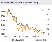 Deepak Nitrate (DN)’s Q2FY26 EBITDA at Rs1.9bn (down 37% YoY; up 9% QoQ) was in line with consensus/our estimates. The AI segment’s uncertain operating environment was defined by sharp pricing pressures (better traction to be seen in H2 for select intermediates). DN launched 7 new products in Q2. The phenolics business fared better sequentially owing to better product mix and reduced feedstock prices. Current environment remains challenging, and we expect gradual recovery in the AI segment from Q4, though phenolics segment spreads remain under pressure. The management expects projects worth Rs20bn to commission over Mar-26 to Jun-26. It expects to spend Rs15bn in FY26 (Rs6.6bn spent in H1) and plans to incur capex of Rs30-40bn in FY27/28, to set up an integrated phenol-BPA-polycarbonate plant. We trim our EBITDA estimate for FY27/28 by 1-3%; REDUCE with unchanged TP of Rs1,800.