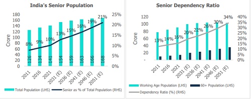 Presently, India is among the youngest large countries, with an average age of just 29 years. However, India’s demographic profile is expected to undergo a massive transformation over the next two decades, leading to changes in economic and social structures. India’s senior/elder population (60+) is estimated to be ~142 million (10% of the total population) in 2021 and is expected to grow to ~231 million by 2036 (15% of the total population) and to ~340-350 million (~21% of the population) by 2051, growing at a CAGR of over 3%.