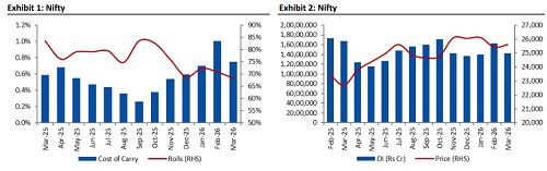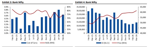 Bank Nifty rollover improved to 74%, compared with 71% in the previous expiry and above the three-month average of 73%. The new series began with open interest at 14.28 lakh shares, the highest level observed in the last three months and approximately 1.88 lakh shares higher than January, signalling strong carry-forward interest. With the index closing in positive territory alongside expanding open interest, the data indicates fresh long buildup in Bank Nifty futures. In contrast to the moderation seen in Nifty futures rollover, Bank Nifty continues to attract positional participation, reinforcing its relative strength and sustained leadership within the broader market structure