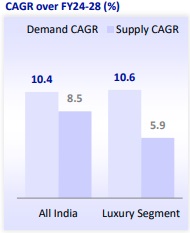 * Even with the commencement of NMIA and temporary shutdown (phased manner) of the T1 terminal, demand in Mumbai is expected to continue improving, led by an increase in international events (concerts, sports, and cultural) and higher MICE activities (supported by the Jio Convention Center). According to HVS, Mumbai’s demand-supply dynamics will continue to remain favorable, supporting healthy performance for MMR hotels.