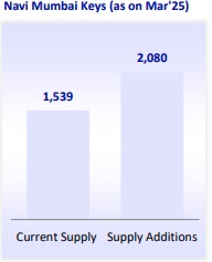 * With the new Navi Mumbai International Airport (NMIA) set to commence operations on Christmas’25, the hotel demand-supply dynamics are set for a major shift. The limited supply of branded rooms (~1,539 keys) and strong demand (the first phase will enable 20m annual passenger capacity) will benefit players such as Chalet Hotels, IHCL, Park, LEMONTRE, and SAMHI, all of which have existing or soon-to-commence presence in the area.
