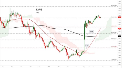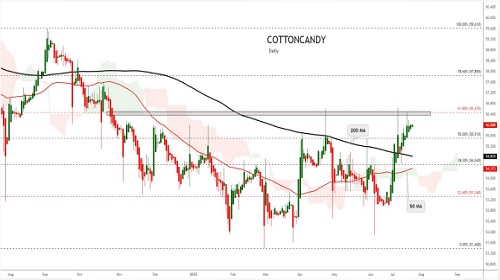 Cottoncandy prices declined by 0.68% to settle at 55,630, pressured by rising domestic and global supply estimates. According to the Cotton Association of India (CAI), closing stocks for the 2024-25 season are projected at 55.59 lakh bales, a significant 84% increase from the previous year. CAI revised its cotton pressing estimate upward to 311.40 lakh bales from 301.14 lakh bales due to higher crop output, pushing the total supply estimate to 380.59 lakh bales. This increase comes alongside subdued export demand, with exports expected to fall 40% year-on-year to 17 lakh bales, while imports are forecast to more than double to 39 lakh bales from last year’s 15.2 lakh bales. By the end of June, stocks stood at 108.01 lakh bales, with textile mills holding 32 lakh bales and the rest distributed among CCI, traders, and exporters. Though domestic consumption is slightly higher at 308 lakh bales, the rise in imports and lower exports signal a bearish outlook. Globally, the U.S. raised its 2025/26 production forecast to 14.60 million bales, a 600,000 bale increase from June. Ending stocks are expected at 4.60 million bales with a stocks-to-use ratio of 32.4%. Global production and ending stocks are also projected higher, led by increases in China, the U.S., and Mexico. Technically, Cottoncandy is under long liquidation with open interest plummeting by 33.33% to just 8, reflecting reduced trader participation. Support lies at 54,270, and a drop below may test 52,910. Resistance is seen at 56,500, above which prices may rise to 57,370.