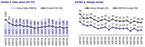 * Reported PAT declined 39% YoY to INR1.2b (in line with est.), down 39% YoY. ? In 1HFY26, its revenue/EBITDA/Adj. PAT declined 10%/35%/42% to INR38b/INR4b/INR2b.
