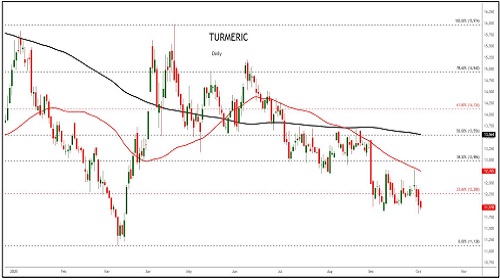 While downside capped as recent rainfall has caused damage to standing turmeric crops in major growing regions.