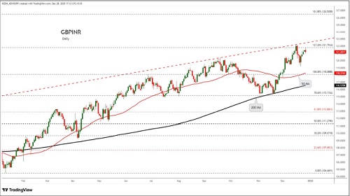 GBPINR trading range for the day is 120.94-121.54.