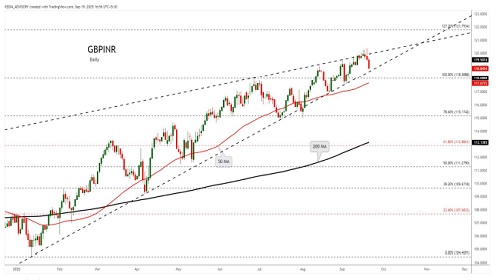 GBPINR trading range for the day is 118.83-119.77.