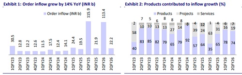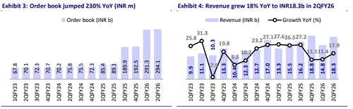 2Q revenue was 12% lower than our estimate as execution remained weaker than our expectations. However, with a better-than-expected EBITDA margin of 16.3%, higher other income, and a lower tax rate, reported PAT came in 42% ahead of our estimate. Revenue grew 18% YoY to INR18.3b (12% below our estimate). EBITDA at INR3.0b (vs. our estimate of INR2.5b) grew 172% YoY. EBITDA margin at 16.3% was 430bp above our expectation of 12%, driven by lower-than-expected operating expenses. PAT increased 406% YoY to INR2.6b, 42% above our estimate. Order inflows grew 14% YoY to INR22.2b, taking the order book to INR294b. Growth in inflows was led by the large orders for GIS and AIS stations, and locomotive transformers. Among segments, industries and renewables were the key contributors to the order book, followed by transmission and transport. For 1HFY26, revenue/EBITDA/PAT growth stood at 15%/188%/531% YoY. OCF came in at INR8.7b vs. an outflow of INR0.8b in 1HFY25. FCF stood at INR807m in 1HFY26 vs. an outflow of INR118.1m in 1HFY25.