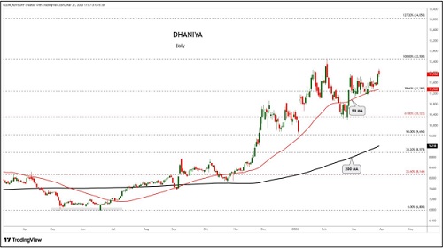 Dhaniya settled flat on profit booking after prices gained driven by lower sowing and rising crop risks.