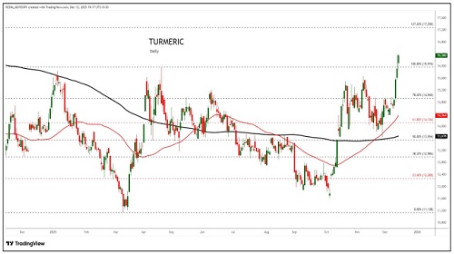 Turmeric dropped amid increase in acreage due to favourable rains during the current sowing season.